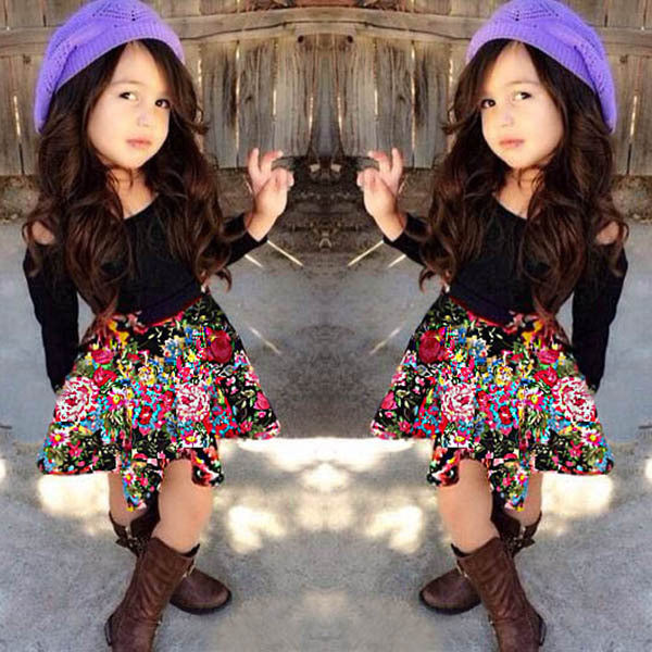 2-7Y Girls Clothing Sets 2pcs Black Long Sleeve Shoulder Off TopFloral Skirt Baby Clothes Dress SM6