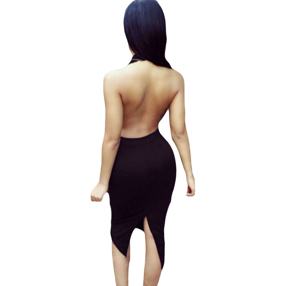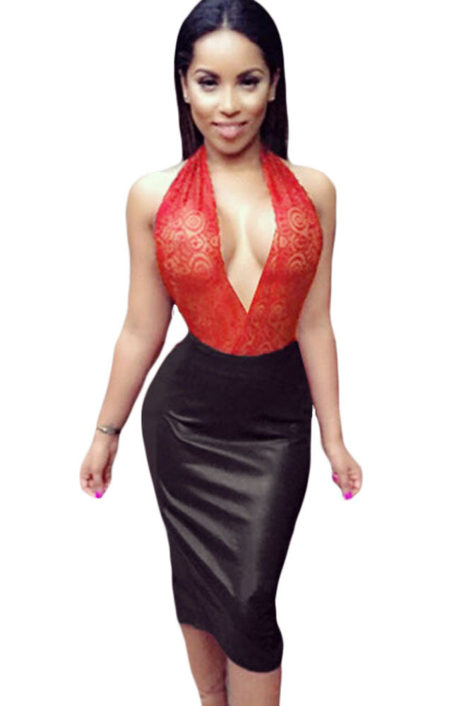 Back-slit Halter Black Lace Top Paneled Pu Leather Dress Sexy Bodycon Dress Club Wear Deep v Neck Lace Midi Dress SM6