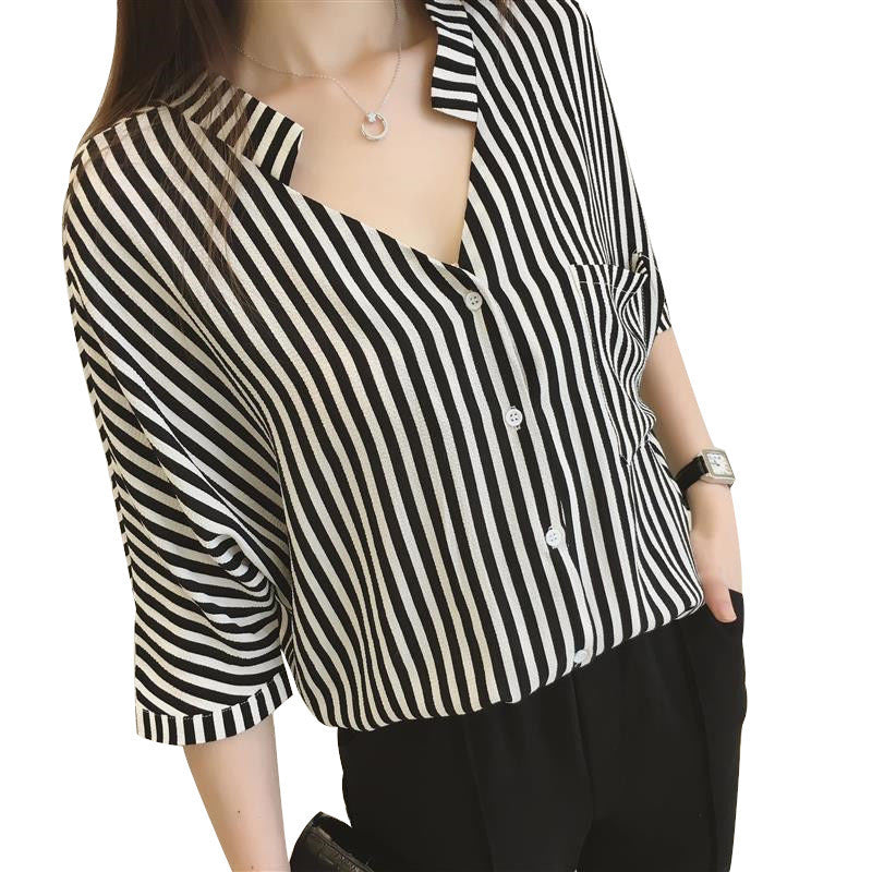 Brand New Fashion Blusas Femininas 3/4 Sleeve Stand Hot Pocket Tops With Button Shirt Polka Dot Stripped Blouse 71044 SM6
