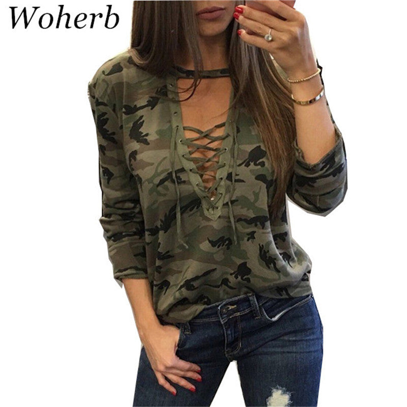 Camouflage Sexy Deep Lace Up V Neck t-shirt New Fashion Woman T shirts Plus Size Full Sleeve BandageTops Tee 72684 SM6