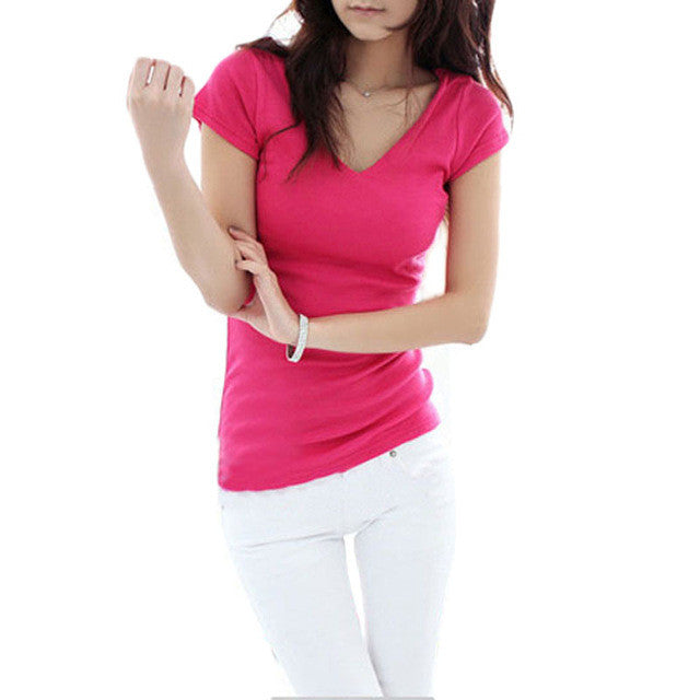 Casual Blusas Femininas 2016 Fashion Women Summer Short Sleeve T-Shirt V-neck Solid Slim Tops Free Shipping S/M/L/XL/XXL SM6