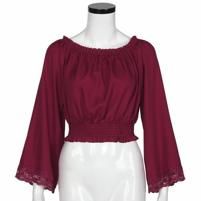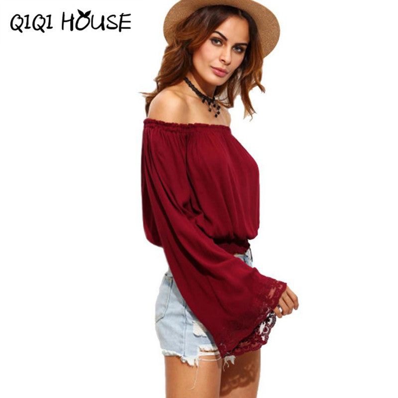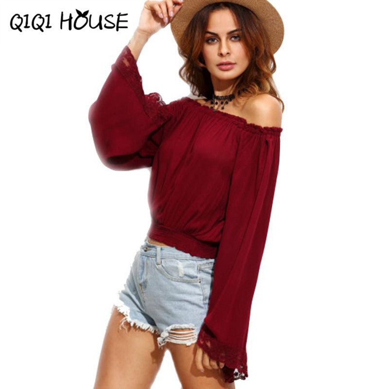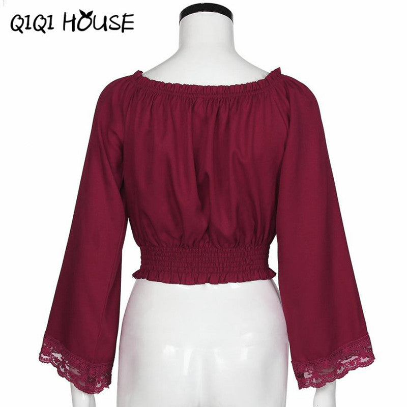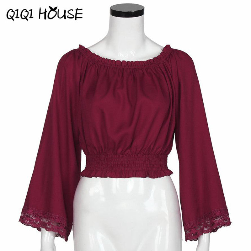 Chiffon Blouse Off Shoulder Flare Sleeve Wine Red Elegant Tops Womens Clothing Lace Loose Blouse Blusas Com Renda#C818 SM6