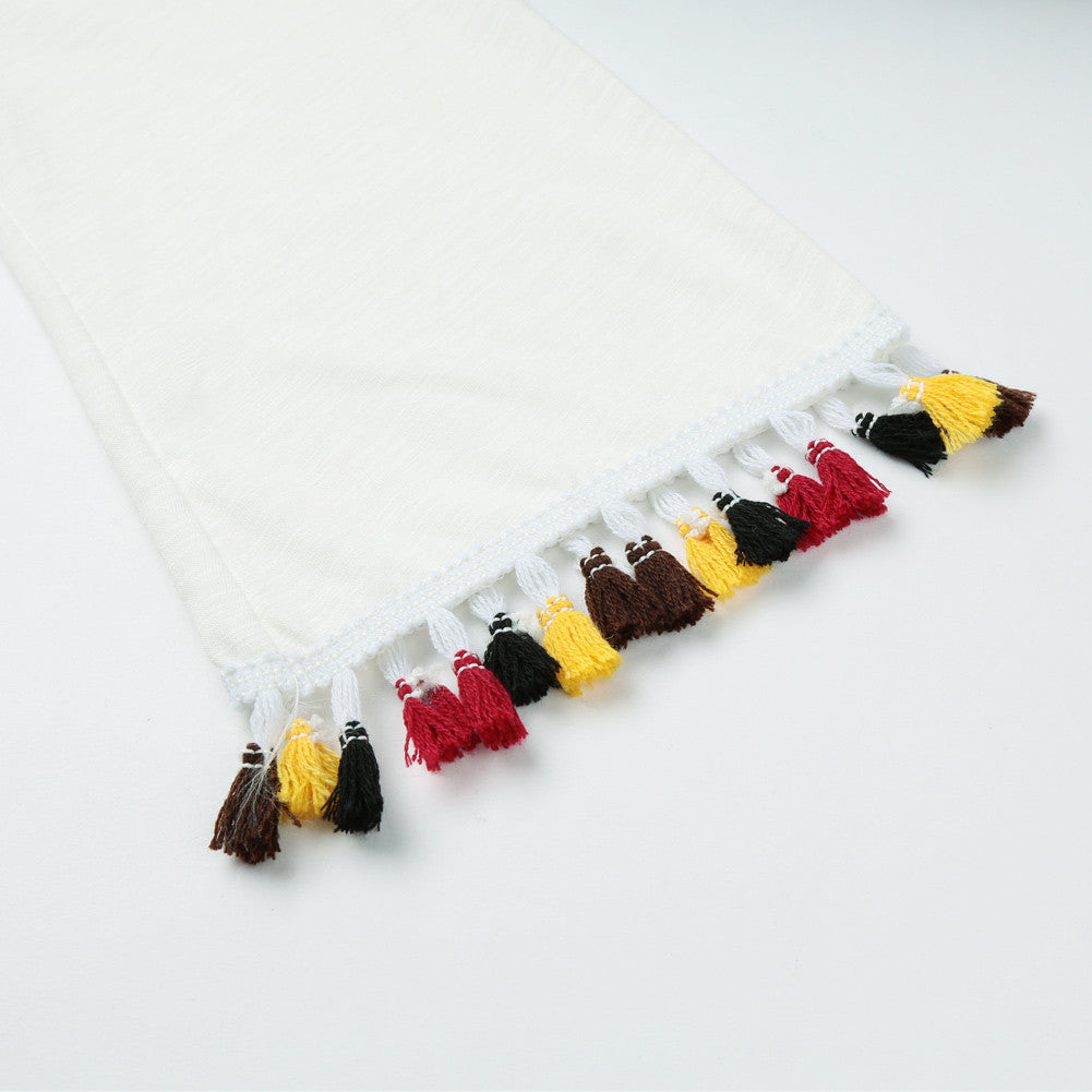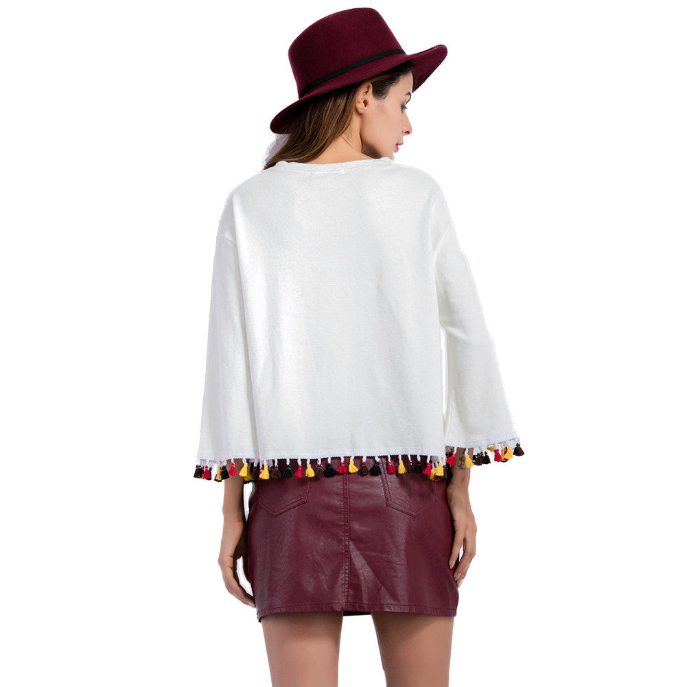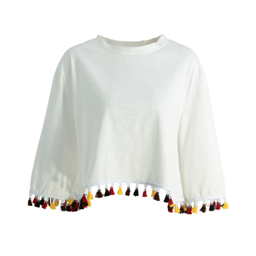 Contrast Tassel Hemline Women Shirt Tops Round Neck Dropped Shoulder Blusas Short Loose Fit Harajuku Clothes White Pullover SM6