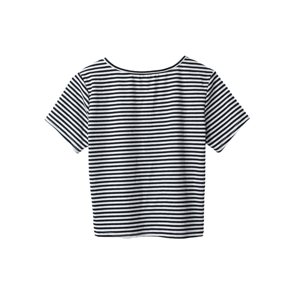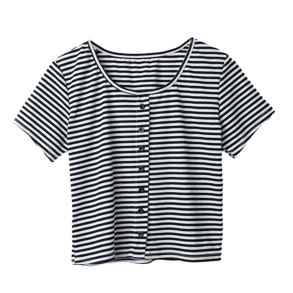 Crop Top Women T-shirt Stripe Round Neck Short Sleeve Tee Shirt Button Casual Short T Shirt Women Tops White SM6