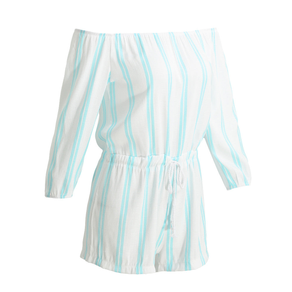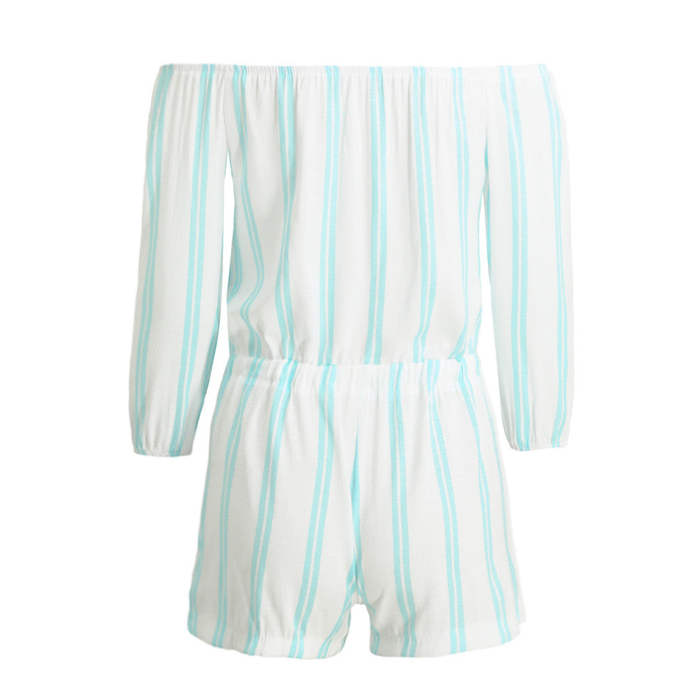Sexy Off The Shoulder Bodysuit Women Mini Playsuits Ladies Blue Striped Long Sleeve Jumpsuits Plus Size SM6