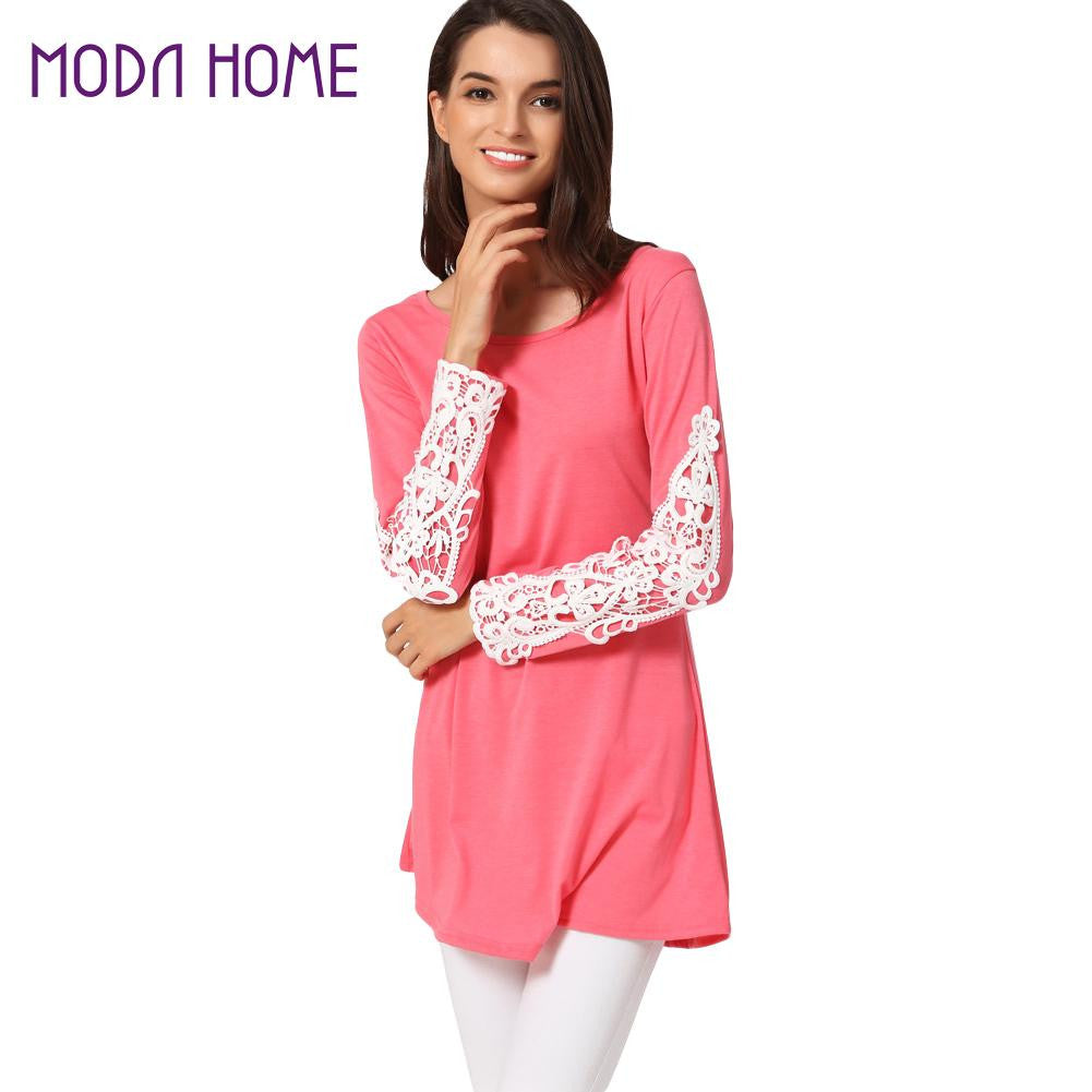 Women T-Shirt Crochet Lace Splicing Womens Tops O Neck Long Sleeve Casual Long Plus Size Top Pullover Black Tee SM6